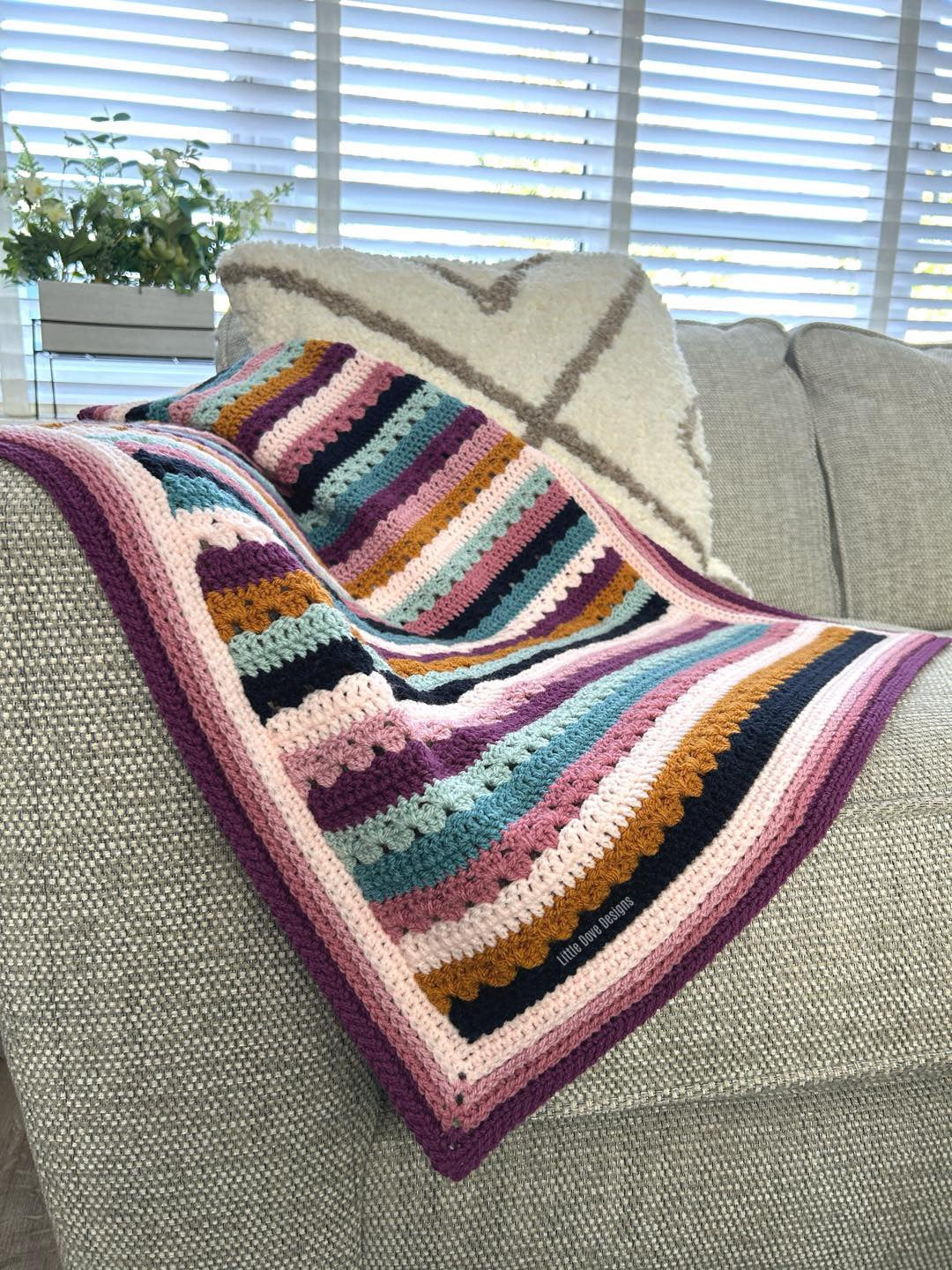‘Cosy Stripe’ blanket in shades of pink, purple, gold and blue.